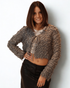 Cardigan in punto pelliccia. Privo di bottoni, lo si chiude con un piccolo fiocco ad altezza seno. Ottimo sui pantaloni vestibilità flered o zampa d'elefante.