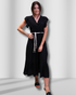 Elegante e versatile, questo abito midi è la scelta perfetta per ogni occasione. Realizzato in tessuto leggero e morbido, presenta una linea fluida con scollo a V incrociato e maniche corte a volant che donano un tocco femminile e raffinato. La gonna ampia con balza sul fondo aggiunge movimento, mentre la cintura in corda intrecciata in vita valorizza la silhouette con semplicità ed eleganza.
