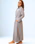 Chemisier abito lungo ampio, manica lunga colletto a camicia, coulisse in punto vita abbottonato fino in fondo. Il tessuto è una viscosa mano lana.