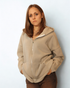 Maglia oversized full zip e cappuccio, presente marsupio con doppia tasca frontale. Zip in contrasto oro. Il capospalla per la tua mezza stagione!