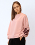 Felpa boxie girocollo volume oversized, lunghezza punto vita, presenta due piccoli spacchi laterali. Ampie maniche chiuse con polsino di cui la sinistra presenta una stampa floccata fiore tribale in colore a contrasto.